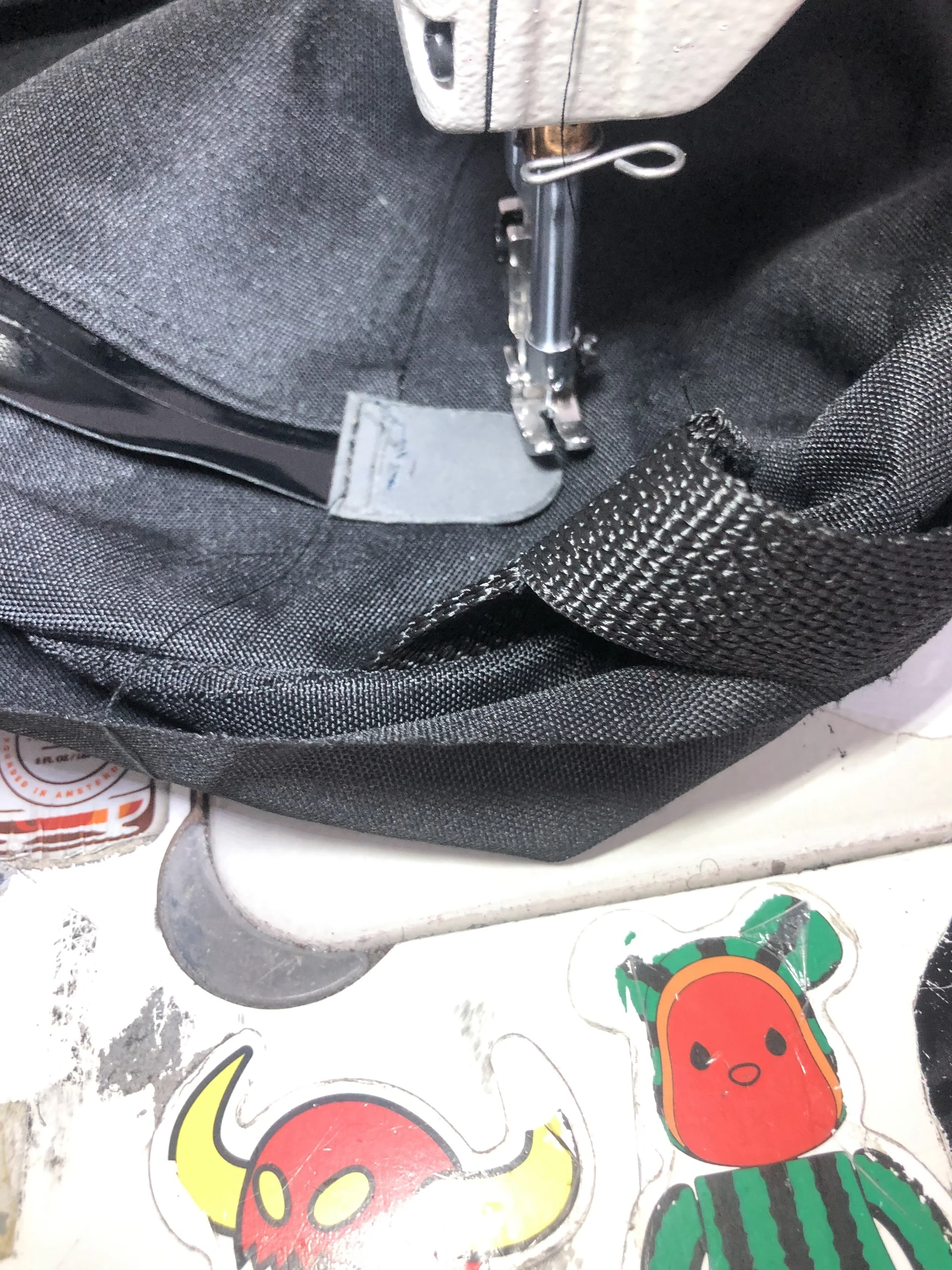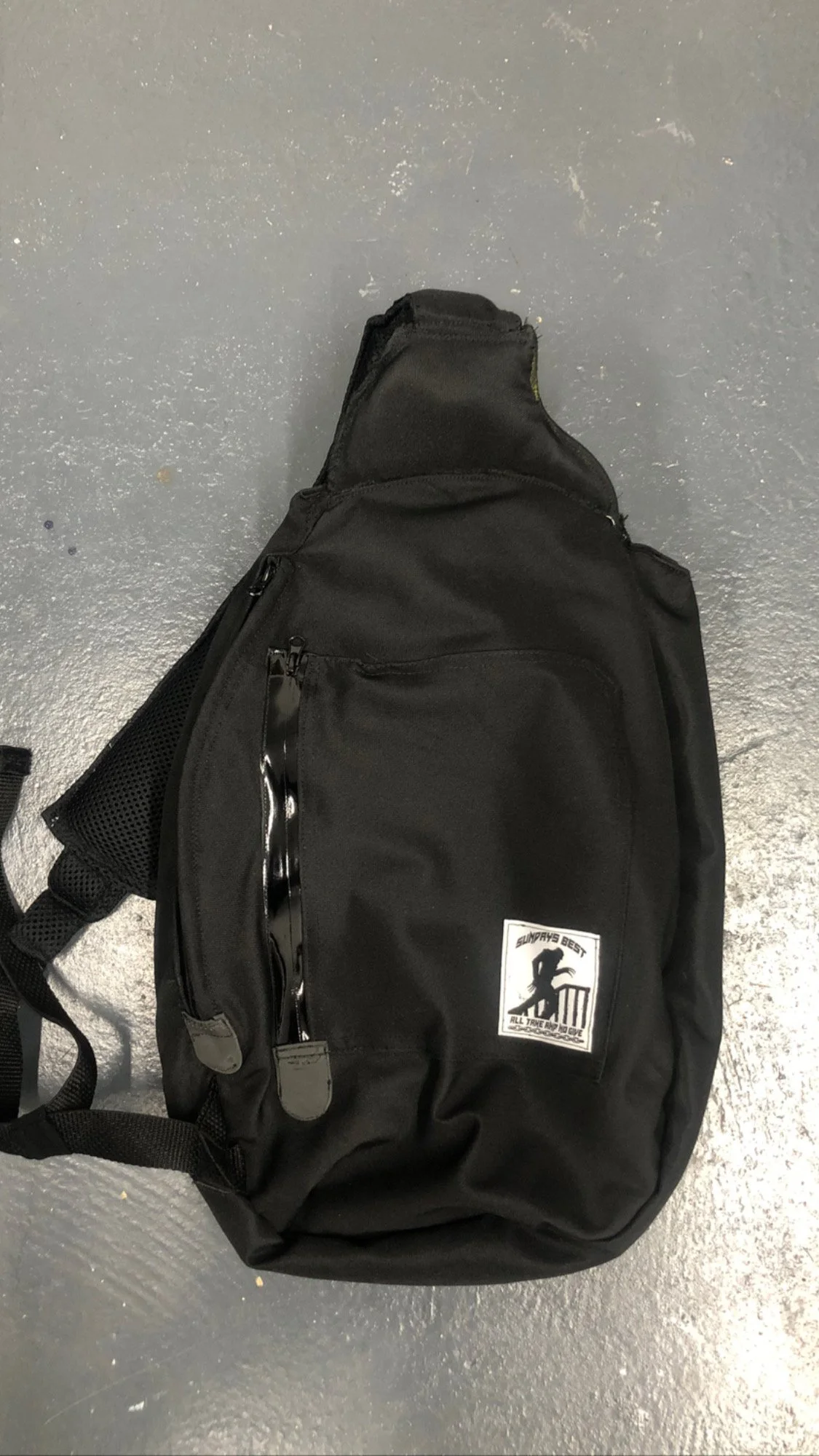 As my notoriety grew in the strange purgatory between graffiti and fashion, a legendary figure in graffiti had reached out in need of a niche product specific to his lifestyle. His name is Spray. He wanted a bag custom made to aid him in his acrobatic street art which includes activities like scaling billboards to inscribe his name, writing on the side of bridges, and using 20 foot telescopic ladders to spray his name on rooftops. This forced me to think critically and account for a wide range of factors that might influence his safety and success. He spoke about the chill of being so high up and how occasionally his cans of paint can freeze. This made me include a wool layer between the face and lining to keep the paint warm. I also made the bag flexible enough to carry a sufficient amount of paint, but compact enough to not leave the user overencumbered. I placed a pocket on the strap along the chest for small necessities like different paint caps and nozzles. The artist is a lefty so I placed the zipper on the bag in a place he could reach with his left hand. Lastly I placed a flexible texon fiberboard(used for lasting sneakers) between the mesh on the back and the lining to protect the user from feeling heir bags contents on their back, and I included mesh for comfort.